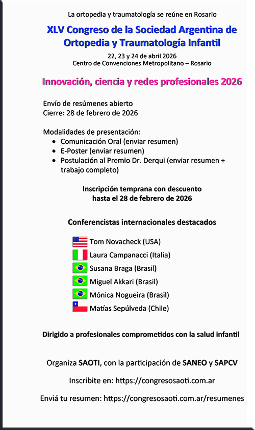 En nombre de la Sociedad Argentina de Ortopedia y Traumatología Infantil, les extiendo un cálido saludo y mis mejores deseos en este día especial. Que sigamos avanzando juntos, fortaleciendo nuestra comunidad profesional y brindando lo mejor de nosotros en cada acción médica que emprendemos.